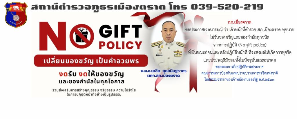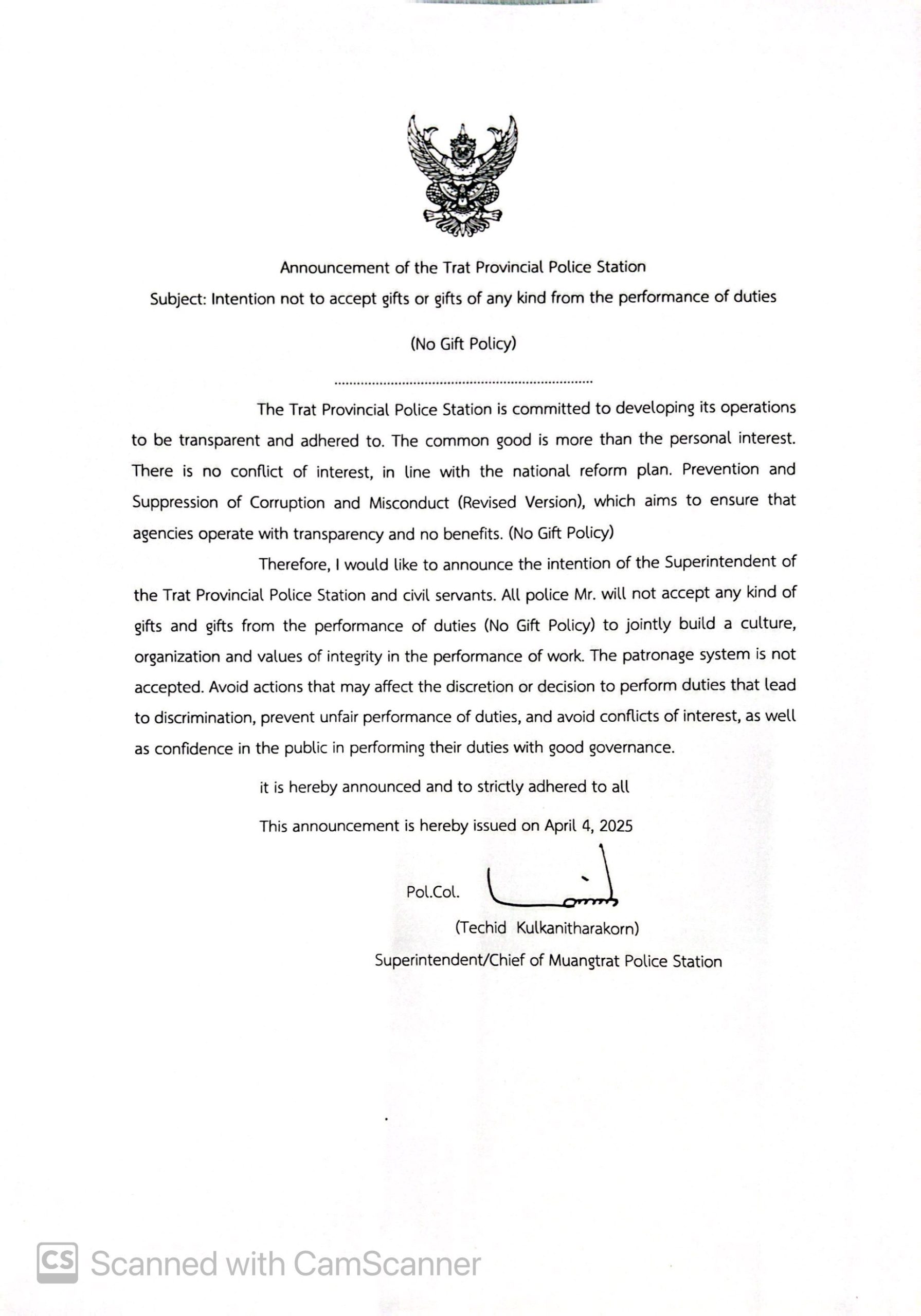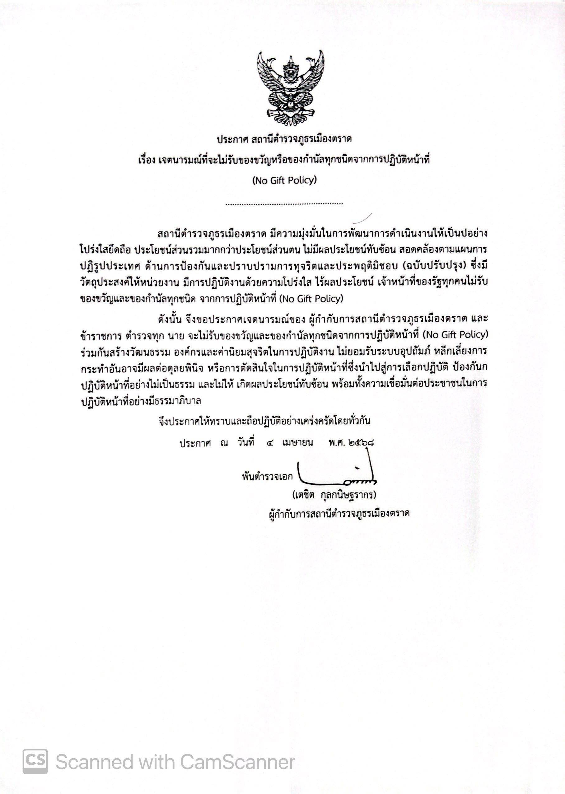 เมื่อวันที่ 16 ตุลาคม 2567 เวลา 10.00 น. พ.ต.อ.นิพลคง เกียรติก้อง ผกก.สภ.เมืองตราด ประกาศมอบนะโยบา